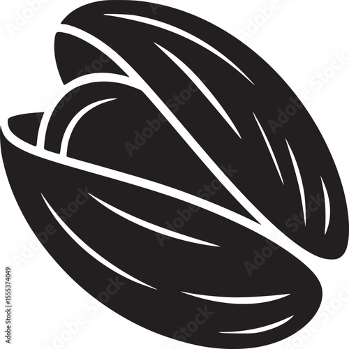 Isolated black and white graphic illustration of an open pistachio nut with visible kernel
