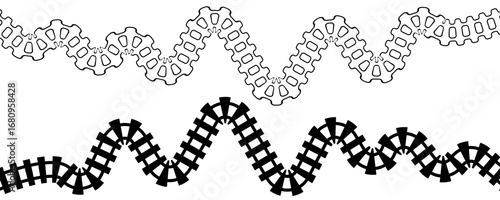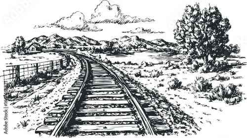Curving train tracks through mountain landscape, stylized linear illustration of remote railway journey