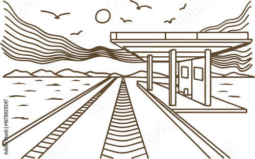 Modern Bridge and Railway Line Illustration with Monochromatic Scheme