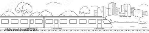 Modern highspeed train on the railway with city skyline in the background, a symbol of urban transportation