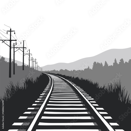 Illustration of a railway track disappearing into the distance, with overhead power lines and vegetation along the side