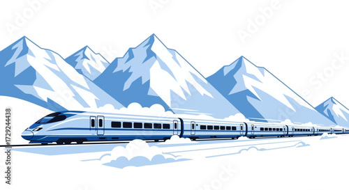 A detailed illustration of a modern high-speed train traveling across a scenic landscape on a sunny day.