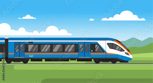 Modern High-Speed Train on the Go with Green Meadow Illustration.