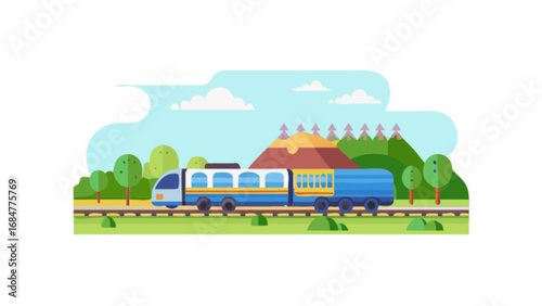 Train travel landscape concept. Summer landscape with train. Vector stock