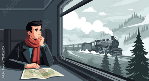 Traveling Man Waves Goodbye Beside Modern Train Towards Mountains and Nature