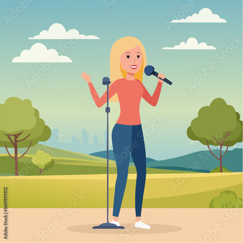 Music and dance summer festival in nature. Vector illustration of a musician playing a trumpet, a girl with a guitar, dancing people, holiday flags, leaves, flowers, for a poster, flyer, social media