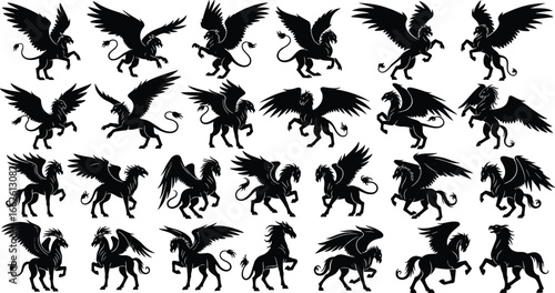 Dragon silhouette set with epic creature poses, wings spread, mythical monster, fantasy beast vector illustration for legend and mythological themes