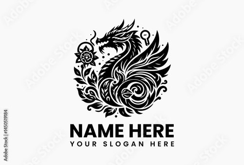 Powerful black dragon silhouette with wide wings, fantasy creature vector illustration, mythical beast design, strong monster art for fantasy and gaming themes