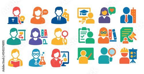 Librarian Icon Set. Librarians organizing books and resources. Icon set. Set Logo of Librarians organizing books and resources: stacked books on shelf.