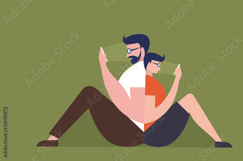 Happy Middle Eastern couple taking a break while moving. Young Muslim family in new home with cardboard boxes, sitting on floor together and looking at smartphone. Vector illustration.