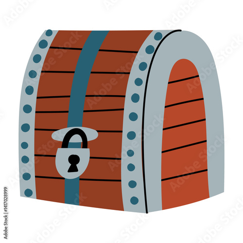 A detailed illustration of a wooden treasure chest with metal reinforcements and a lock