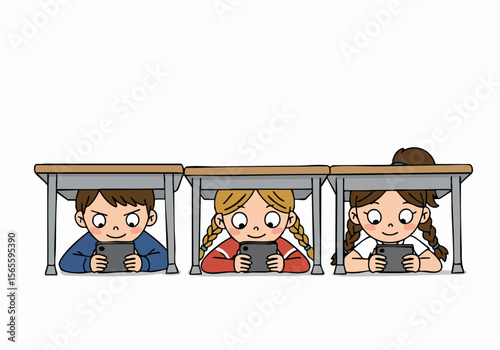 Children sitting at their desks in a classroom, a bully making a threatening gesture towards his classmate, EPS 8 vector illustration, no transparencies