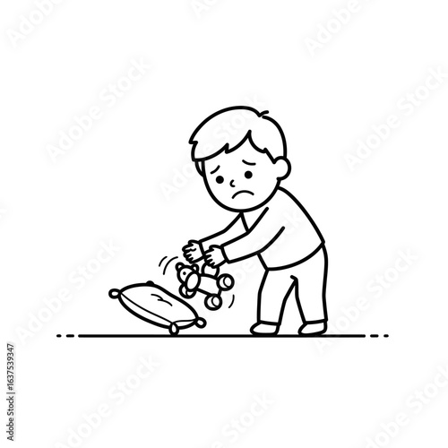 Line art illustration of a sad frowning boy aggressively hitting a teddy bear on a pillow.