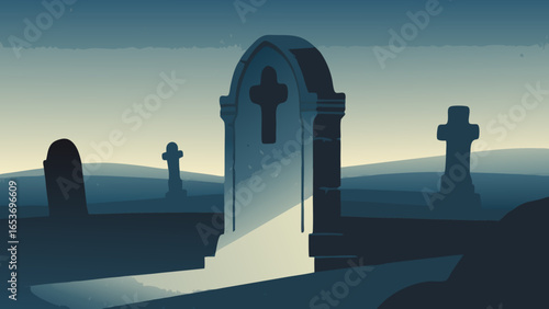 Cemetery illustration with tombstones, crosses and trees, a serene scene