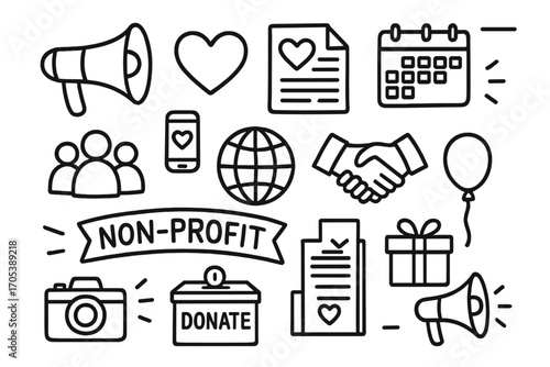 Non-Profit Symbols Doodle. Hand-drawn doodle illustration Non-profit awareness megaphone, heart, flyer, calendar, group of people,