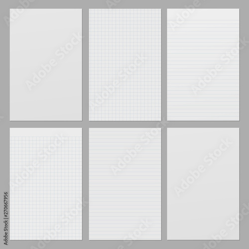 Set of realistic vector illustration of blank sheets of square and lined paper from a block isolated on a gray background