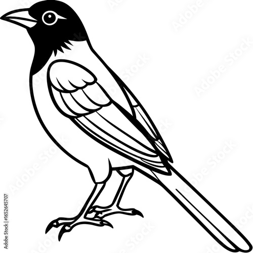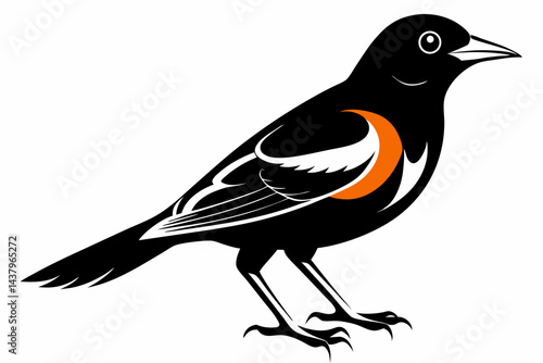 Black bird perched on branch, orange and white wing markings, detailed songbird illustration, wildlife nature drawing, exotic oriole artwork, cad drawing flat vector illustration