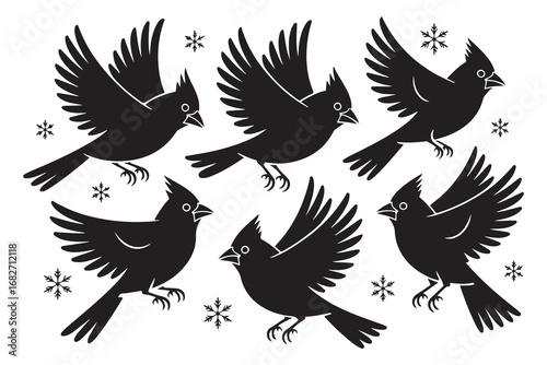 Silhouette illustration showing a large group of birds in various flying positions against a white background
