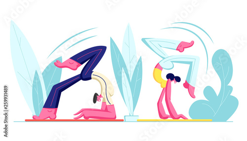 Couple of Young Man and Woman Characters Working Out Yoga Exercises Doing Advanced Inversion and Arm Balance Scorpion Handstand Vrischikasana, Healthy Sport Activity. Cartoon Flat Vector Illustration