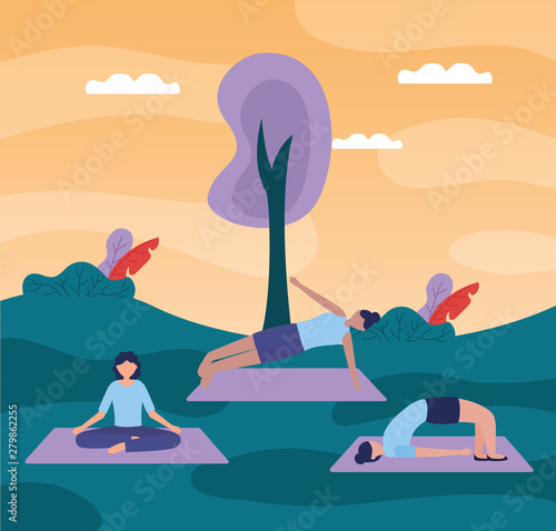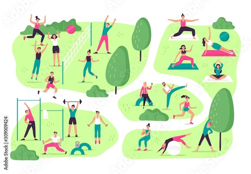 People do sports in park. Outdoor sport activities, group workout and healthy lifestyle. Beautiful sport people outdoor yoga, running and training vector illustration