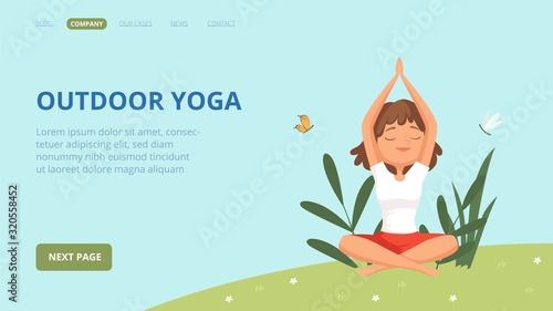 Outdoor yoga landing page. Woman doing exercises in park. Relaxation and meditation vector banner. Illustration woman yoga exercise, healthy and meditating