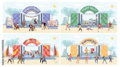 Different outdoor park festival activities for people. Kids performance, sport fest, family event, music entertainment. Couple, friends, sportive characters, children visitors. Sport, health, fun set