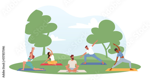 People Doing Exercises in Park. Male and Female Characters Outdoor Yoga Activity. Fitness, Workout in Different Poses