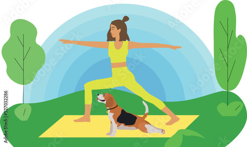 A young cute girl with a dog is doing yoga in the park. Happy pet owner. Flat vector illustration. Charming beagle. Active recreation concept. Dog is man's best friend. outdoor sports