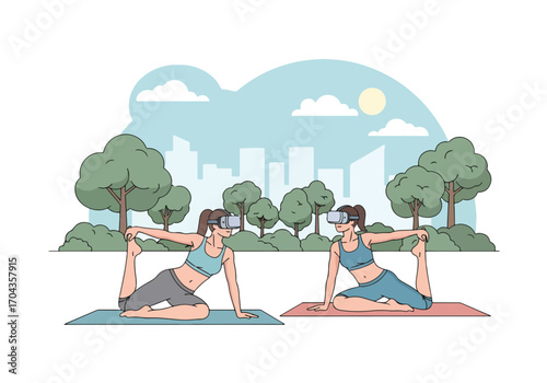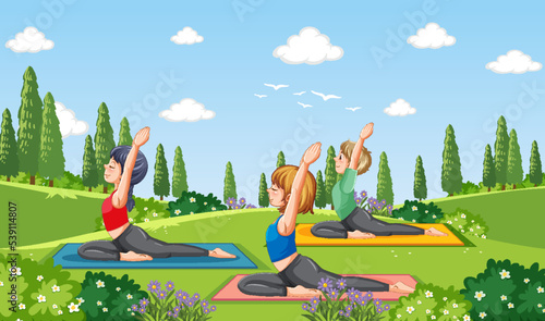Young women doing yoga exercises outdoors in a health and fitness or healthy lifestyle concept, vector illustration