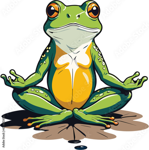 Vector of a cheerful green frog in a tranquil outdoor setting, gracefully practicing yoga