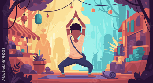 Person doing yoga in a vibrant outdoor market setting, perfect for wellness websites or travel brochures.