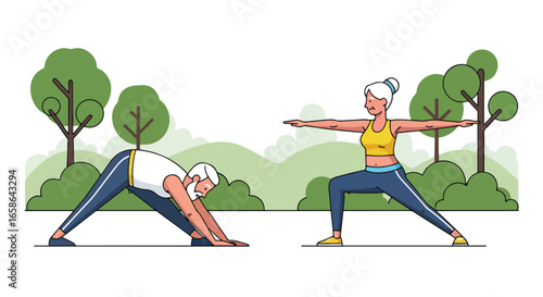 Elderly couple practicing yoga outdoors on mats, stretching and balancing in park. Healthy senior lifestyle illustration promoting fitness, relaxation, and active aging