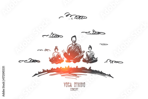 Outdoor yoga class, meditation, mindfulness, healthy lifestyle, retreat tour, rest in nature, flat vector illustration.