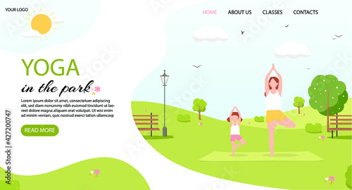 Vector banner or landing page with mom and kid doing yoga in the park. Vector illustration of yoga nature. Healthy people lifestyle, eps 10