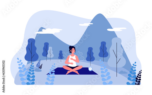 Peaceful woman meditating with clock vector illustration. Person doing yoga and focusing on breathing outdoor with mountains in background. Mindful breathing, self-care, mental health concept