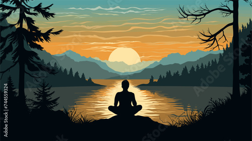 Silhouette of a person in a contemplative yoga pose surrounded by nature. simple Vector art