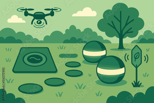 Illustration of a drone flying over a yoga mat and wellness items in a green outdoor setting.