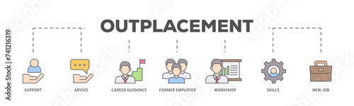 Outplacement banner web icon illustration concept with icon of support, advice, career guidance, former employer, workshop, skills, new job