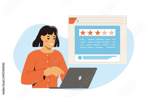 Customer review and feedback concept. Online testimonials and user rating stars on computer screen. Client satisfaction survey, consumer opinion, and user experience messages.