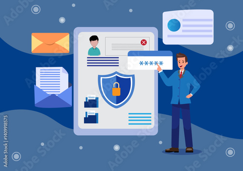 Cybersecurity protection concept. Man with tablet and shield. Data privacy safety. Secure internet network. Digital lock. Antivirus guard. Web defense. Firewall technology. IT safe.