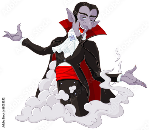 A stylized black and white illustration of a vampire with a bat wing cape and a tie on a light gray background on transparent background
