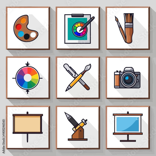 Various types of vintage and modern cameras with framed landscape artwork displayed creatively for artistic inspiration, photography, retro and digital imaging vector cartoon illustration