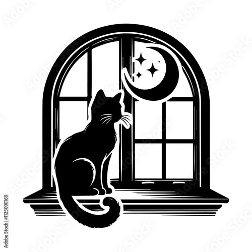 Black cat silhouette sitting on a windowsill looking out a window silhouette