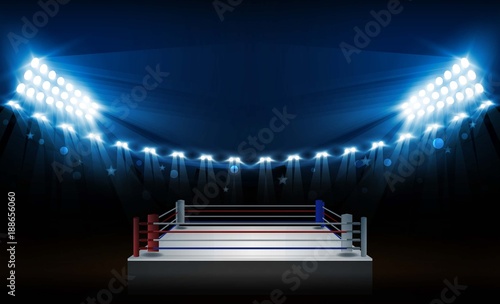 Boxing ring arena and floodlights vector design Bright stadium arena lights red blue. Vector illumination