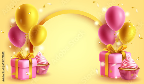 Happy birthday vector banner design. Birthday text with party and event gift wrap decoration. Vector illustration bday icon in pink background.