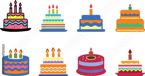 Set of Birthday decoration with sweet cake with candles. Vector retro style isolated on white. Cut file