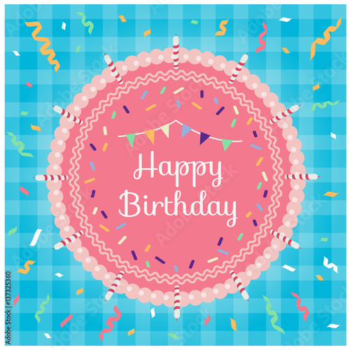 Happy birthday - Top view pink cake and ribbon party on blue fabric background vector design