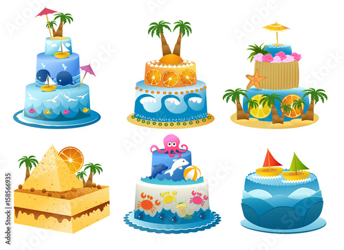 Set of cakes for birthday, holiday. Vector sticker collection of sweet cheesecakes, cupcakes, bento cakes.