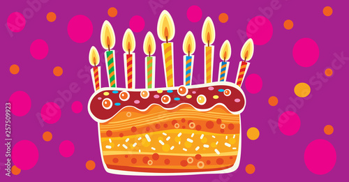 Happy birthday card. Funny birthday chocolate cake with candles. Vector illustration.