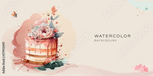 Colorful pink birthday cake watercolor in vintage style on white background. Hand drawn vector poster. Wedding invitation poster.